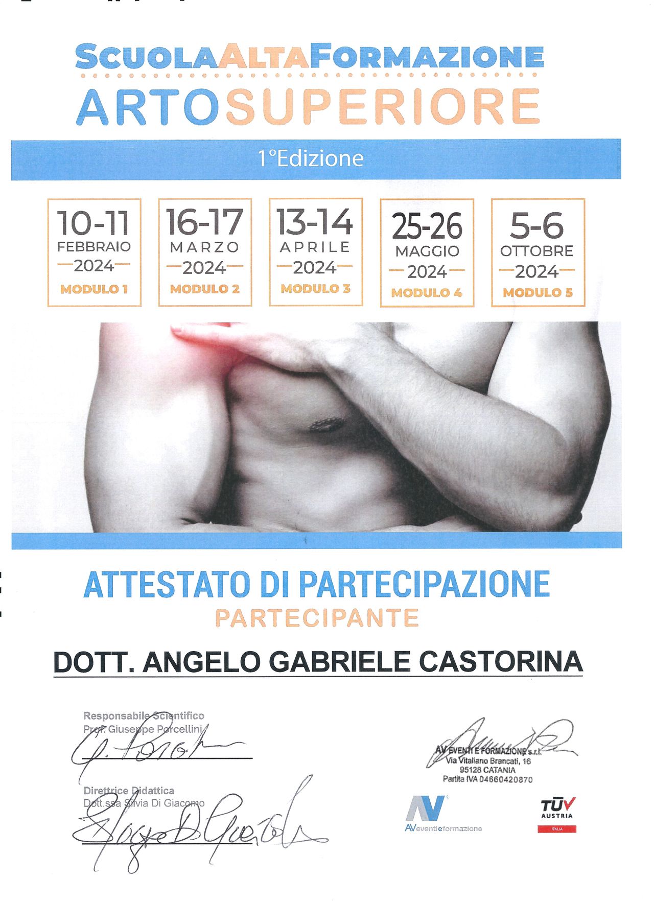 Al fine di avere un approccio multidisciplinare, ho frequentato numerosi corsi di durata pluriennale, tra cui quello di “Medicina Manuale Ortopedica e Osteopatica secondo Robert Maigne” di Padova nel 2018, la Scuola di Alta Formazione dell'Arto Superiore diretta dal professor Giuseppe Porcellini nel 2023.